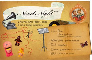 長らくお休みしていた、音楽とおやつとワークショップと占いが楽しめる複合イベント、“novel night!”が2010年より復活、第一弾はnovelcellpoemオフィスからもすぐ近くの三軒茶屋のくつろぎラウンジカフェa-bridgeで2月27日に開催します。