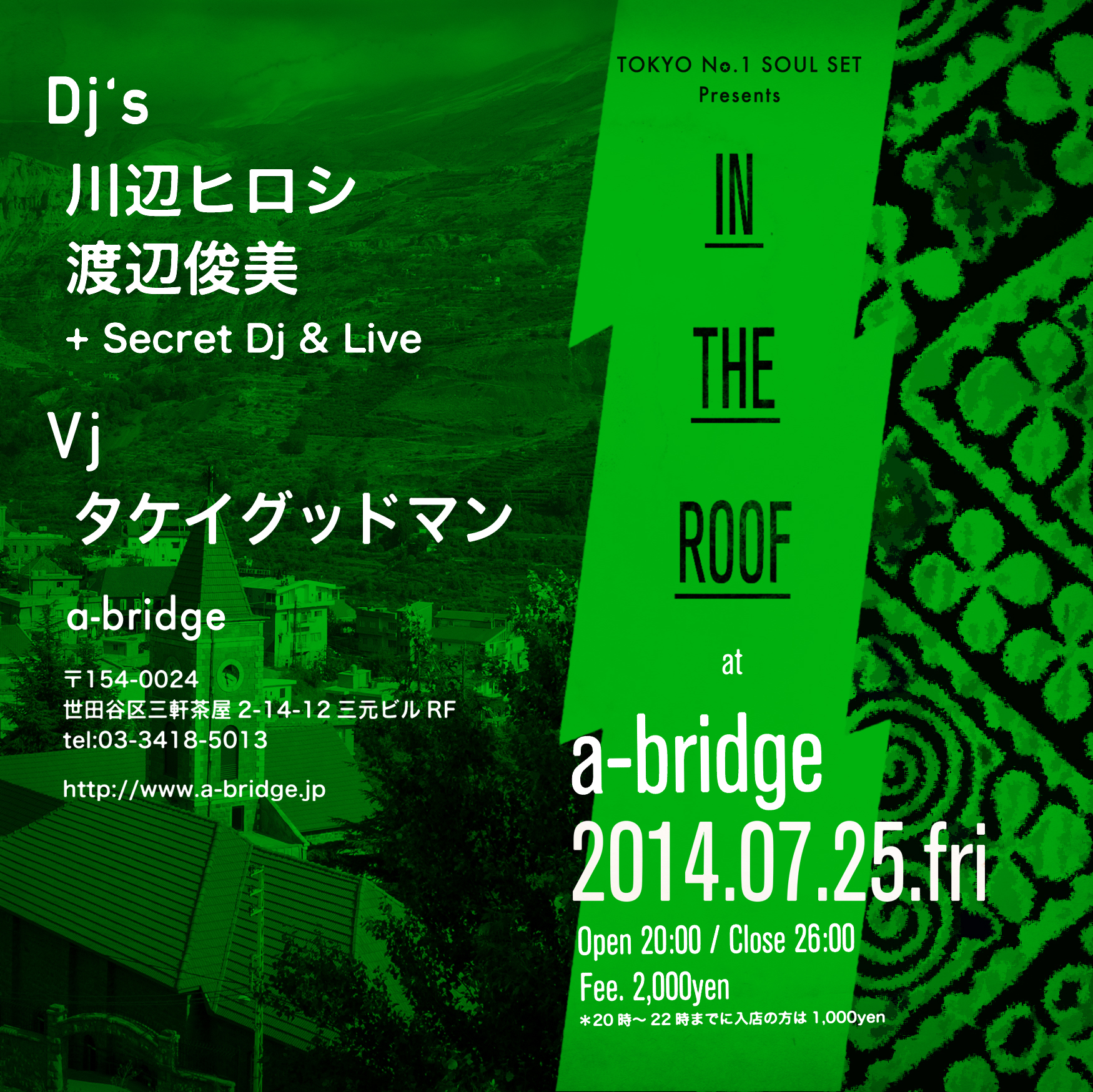 2014.07.25.fri TOKYO No.1 SOUL SET PRESENTS IN THE ROOF Open 20:00 / Close 26:00 fee. 2,000yen ※20時~22時までに入店の方は1,000yen Dj's