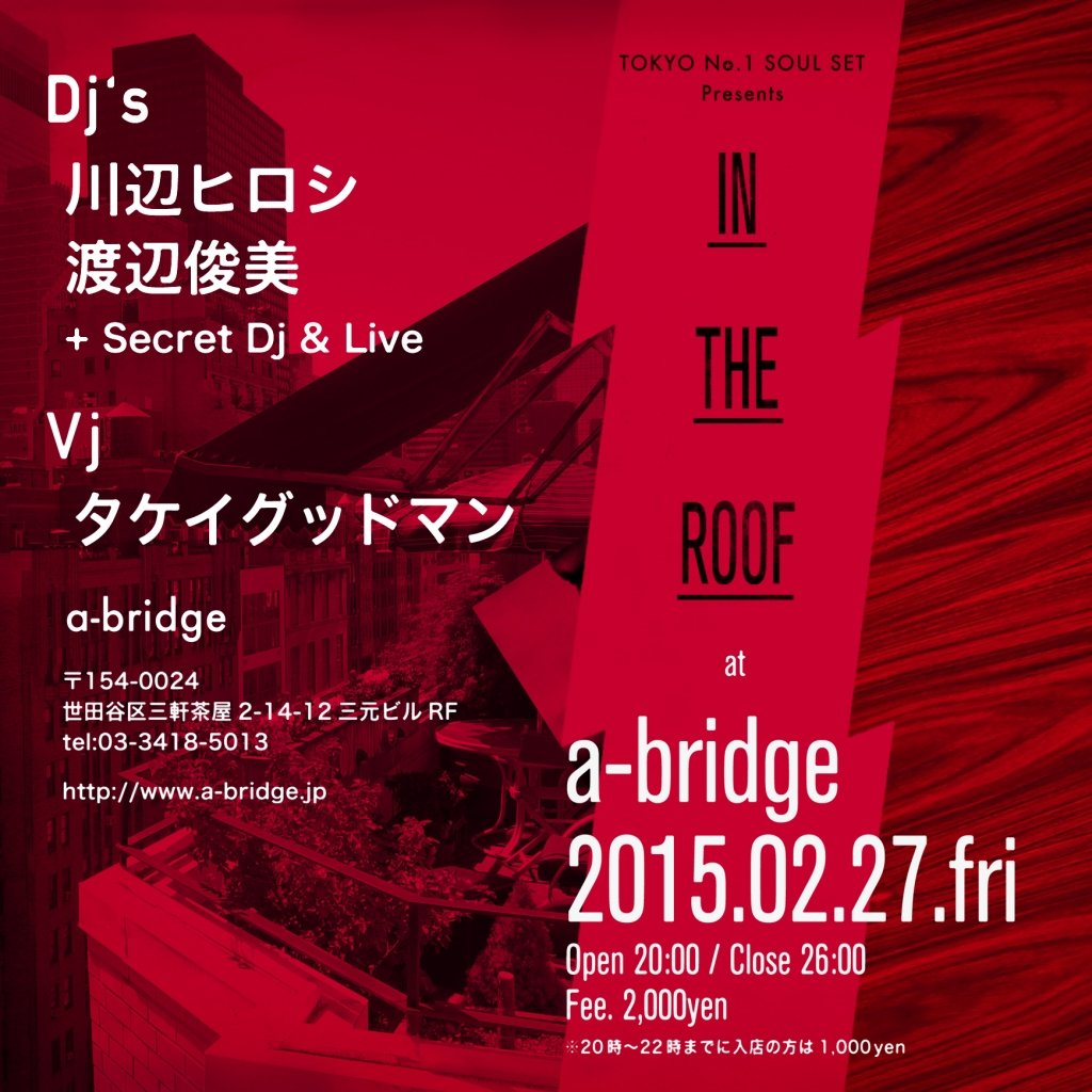 2015.2.27.fri TOKYO No.1 SOUL SET PRESENTS IN THE ROOF Open 20:00 / Close 26:00 fee. 2,000yen ※20時~22時までに入店の方は1,000yen Dj's