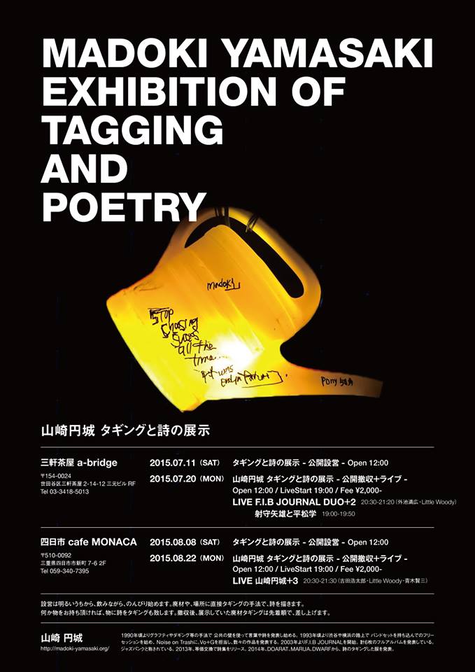詩人 山崎円城(F.I.B JOURNAL)が、三軒茶屋a-bridgeと四日市MONACAにてタギングと詩の展示を。