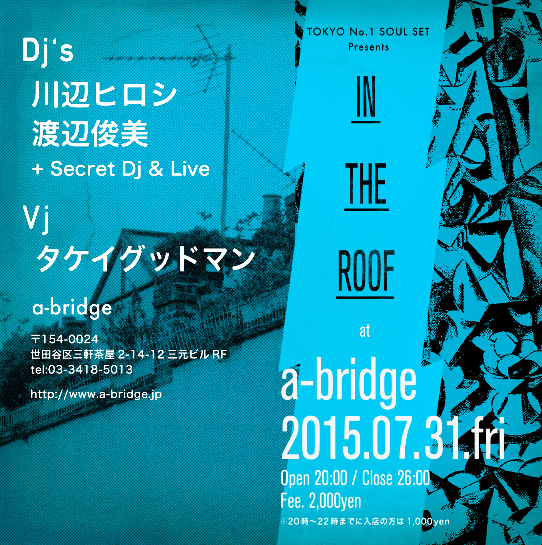 2015.07.31.fri TOKYO No.1 SOUL SET PRESENTS IN THE ROOF Open 20:00 / Close 26:00 fee. 2,000yen ※20時~22時までに入店の方は1,000yen Dj's 川辺ヒロシ
