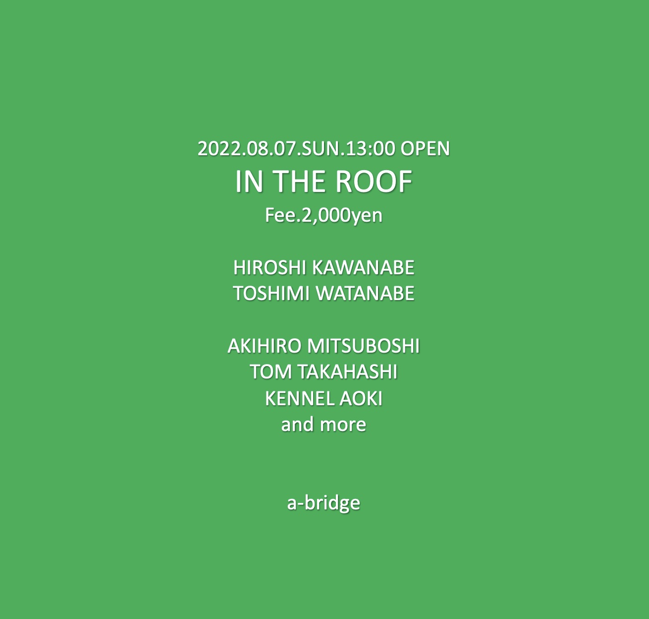 2016.07.29.fri TOKYO No.1 SOUL SET PRESENTS IN THE ROOF Open 20:00 / Close 26:00 fee. 2,000yen ※20時~22時までに入店の方は1,000yen Dj's 川辺ヒロシ